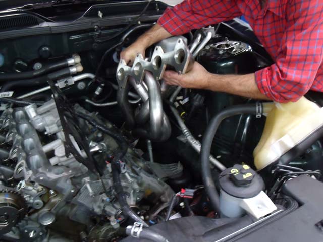 Damit es nicht so schwer wird, kommen zuerst die Krümmer rein, bevor die Köpfe wieder auf dem Motor sind.